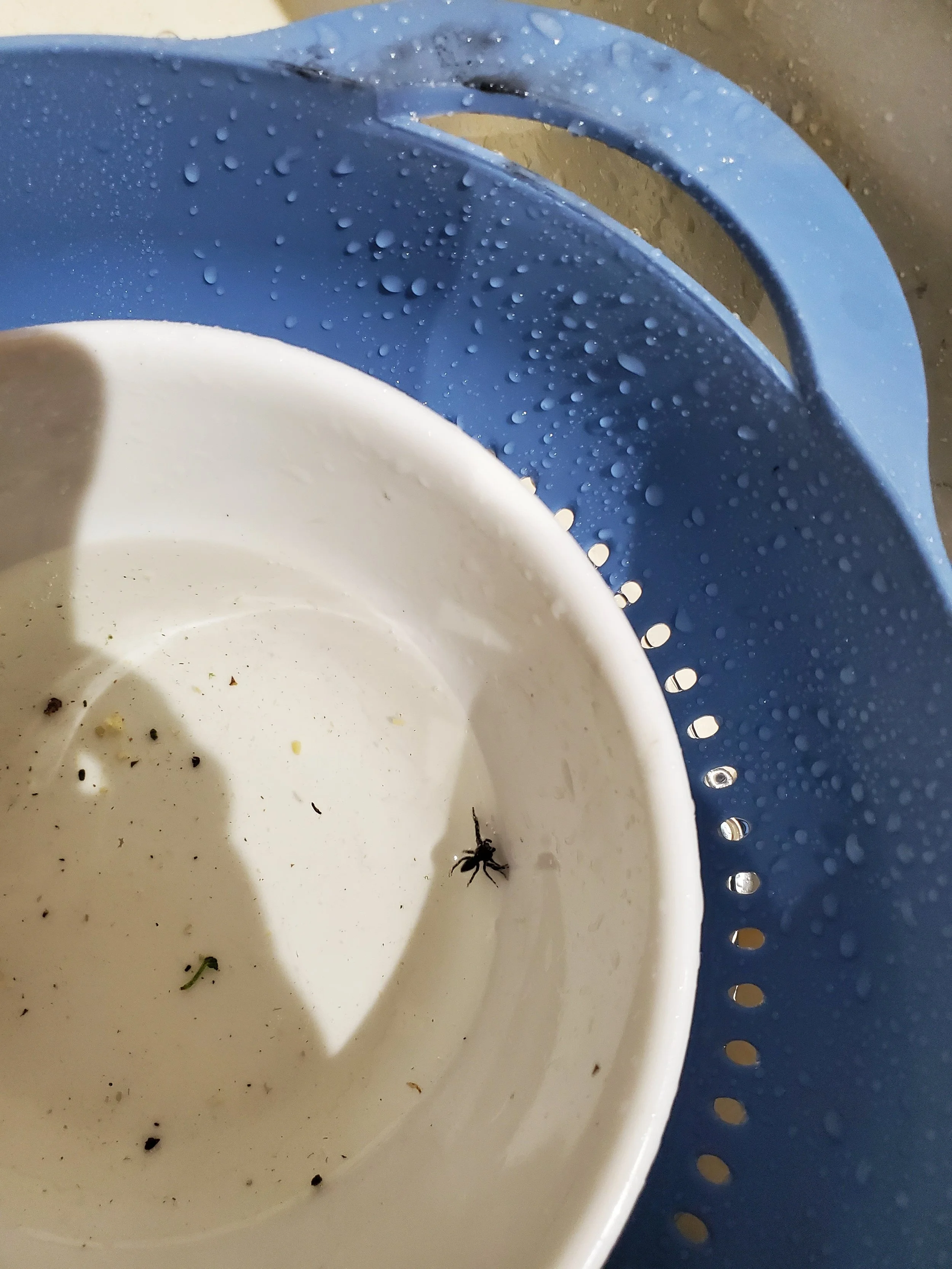 In my defense, I thought the Spider King and I were good, so I wasn’t expecting the lone spider infiltrating my coffee maker (it must have taken a page from the Mice Kingdom’s way to wage warfare on humans). Upon showing “Him” the photographic evidence, he tried explaining it away as the coffee pot was warmer than the house, and that was why the spider was there. Then, as we were washing dishes, a black blob dropped from the ceiling. I didn’t see it - it was “Him’s” yelp and clattering of dishes that alerted me to a problem.